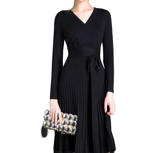 Style: Women Knitted Pleated Deep V-Neck Midi Dress